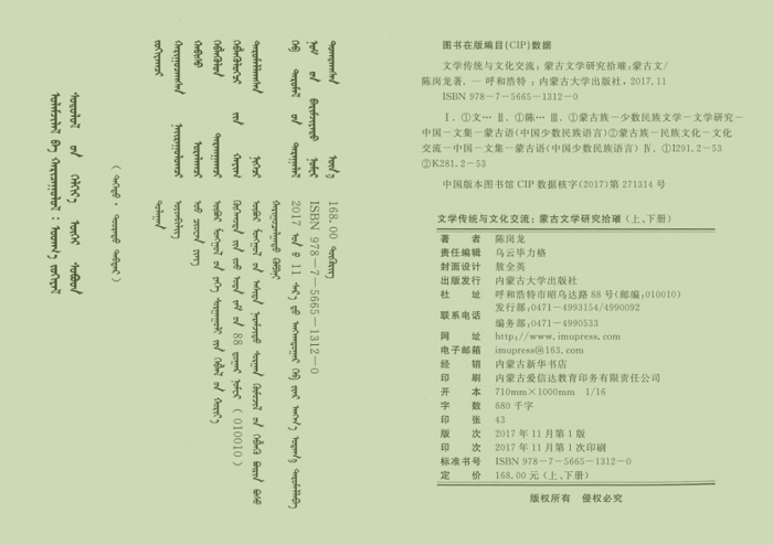 《文学传统与文化交流:蒙古文学研究拾璀》是陈岗龙教授1993年至2017年用蒙古文撰写的研究蒙古族文学和民俗文化的论文合集,收入了文学和文化研究方面的46篇学术论文,是国内蒙古民族文学和蒙古族比较文学研究的重要成果之一。
