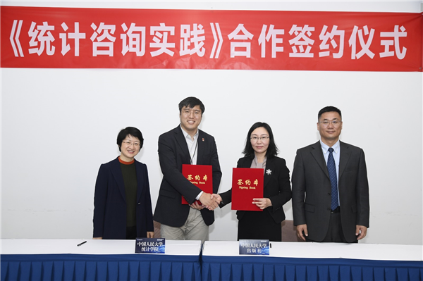 2021年11月17日,中国人民大学出版社与中国人民大学统计学院共同签署《统计咨询实践》的出版合同,该著作是中国人民大学统计咨询平台的一项重要成果。签约仪式在中国人民大学逸夫会议中心举行,中国人民大学副校长王轶、发展规划处处长杨东等校内领导,统计学院院长王晓军、副院长李扬,中国人民大学出版社社长李永强、副总编辑于波等出席仪式。另有十余位校外专家、业界代表,及统计学院师生代表参会。