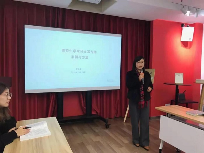 曾桂娥教授首先介绍了上海大学“研究生学术论文写作”丛书策划的思路及编委会情况,强调此丛书是在钱伟长教育思想指引下策划编写而成的。随后,她与大家分享了由自己主编的丛书之《英美文学研究论文写作:案例与方法》出版全过程,并与大家交流了自己多年以来在外国文学研究论文写作上的教学经验。她希望研究生们能够站在前人的肩膀上做学问,逐渐培养起学术思考的习惯和论文写作的兴趣,在做学术研究的同时培养共情能力和认识世界的能力。