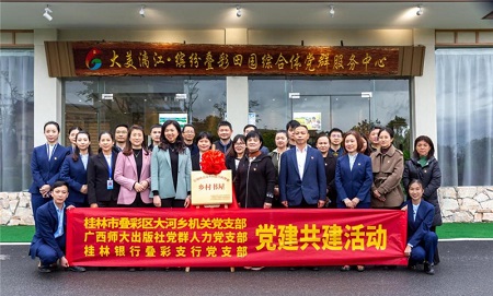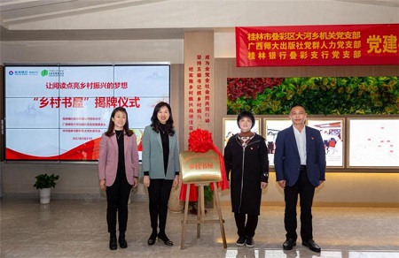 3月31日下午,广西师范大学出版社集团公司文化发展基金会与桂林银行桂林分行、桂林市叠彩区大河乡党委共同举行了大美漓江缤纷叠彩田园综合体党群服务中心“乡村书屋”揭牌仪式。