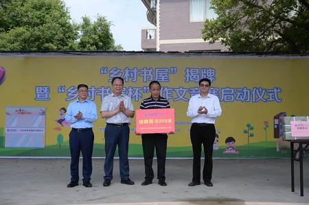 随后,文泽鸿、黄轩庄、范军民、蒋闻、吴海云及上阳家村农村普惠金融综合服务点站长阳开发为第19家乡村书屋揭牌。文泽鸿代表市教育局、黄轩庄代表广西师范大学出版社、范军民代表桂林银行分别向叠彩区大河乡上阳家村“乡村书屋”捐赠图书。值得一提的是,本次活动的奖品还得到了上海晨光公益基金会、广西独秀书房图书有限公司等单位的特别支持。