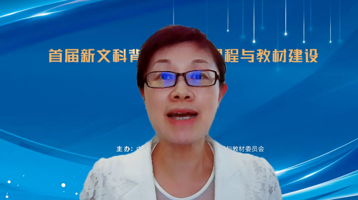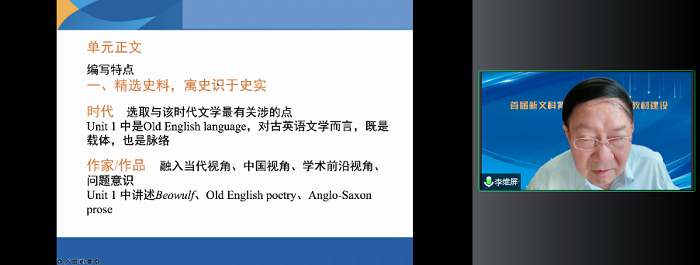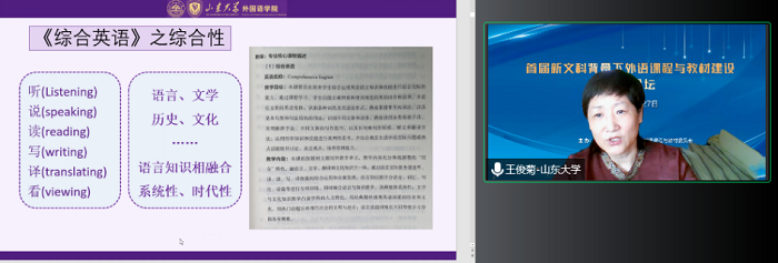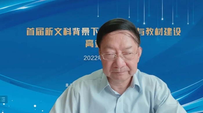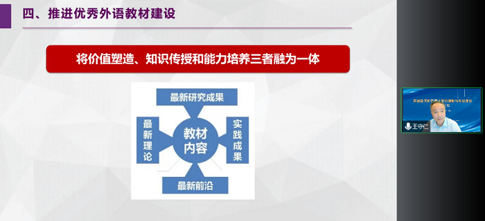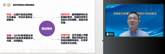 首先发言的是南京大学王守仁教授,报告题目为“新文科背景下的外语教材建设”。王教授从新文科的内涵、新外语的建设理念、《国标》和《指南》、推进优秀外语教材建设以及教材建设引领教学改革五个方面对新文科背景下的外语教材建设进行解读和分析。王教授剖析了“新文科”这一教育概念,提出“守正创新”作为新外语的建设理念,强调了课程与教材的密切关系,并指出,在外语教材建设中应树立正确导向,将价值塑造、知识传授和能力培养三者融为一体,在教学改革中应发挥教材的价值引领、理念引领、方法引领、技术引领。