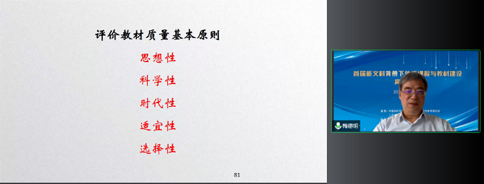 随后,上海外国语大学梅德明教授作题为“外语课程教材建设的根本遵循与评价标准”的主旨报告。梅教授通过追溯新中国教材建设的发展历程,指出党和政府一直以来对于教科书事业的重视,强调教材建设对人才培养至关重要。梅教授指出,核心教材传授的内容、倡导的价值一定是国家意志、国家事权,教材建设要围绕“立德树人、培根铸魂、启智增慧”这十二个字展开。梅教授就教材质量的评价标准提出五个基本原则——思想性、科学性、时代性、适宜性、选择性。