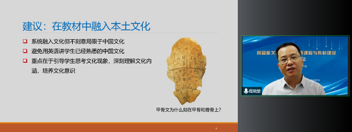 北京师范大学程晓堂教授报告题目为“英语教材中融入本土文化的策略”。程教授通过分析有关中国文化的外语教材的编写,提出在教材编写中要系统融入文化,除中国文化外还应包含世界各国文化;要避免仅用英语介绍学生已经熟悉的中国文化;教材内容要引导学生思考文化现象,深刻理解文化内涵,培养文化意识;教材既要包括传统文化,也要包括现代和当代文化;教材要注重联系学生自己的文化经验、认知、情感。