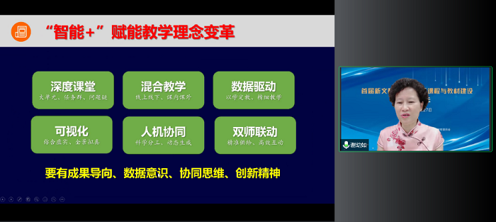 第四位发言专家是华南师范大学谢幼如教授,报告题目为“人工赋能新文科课程变革”。国家目前正在推动的教育数字化转型呼唤教学创新,教育改革的阵地在课堂,课堂教学是教育数字化转型的核心。人工智能赋能教学是实现教学过程数字化的重要教育改革创新。谢教授指出人工智能赋能课程变革的表征包含教学理念变革、教学空间重构以及教学活动创新,她还通过具体的课程案例介绍了人工智能是如何赋能新文科课程变革的。