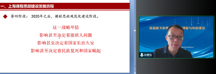 下午首场主旨报告由上海市教科院德育研究院党支部书记、副院长宗爱东开场,报告题目是“新文科背景下的课程思政——一场深刻的改革”。宗书记回顾了上海课程思政建设的发展脉络,强调课程思政建设在学校落地生根至少要经历政策、规范、文化三个层面。在厘定了课程思政的内涵后,宗书记具体分析了新文科与课程思政的关联。他认为,新文科背景下的课程思政是一种教育趋势的转变,一种教育立场的坚定,也是一种教育方法的回归。