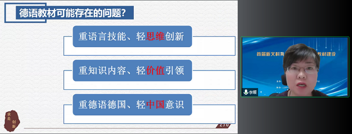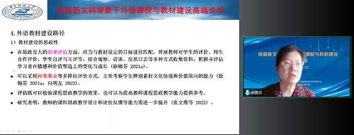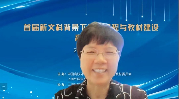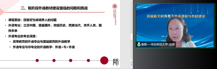 华东师范大学思勉人文高等研究院院长袁筱一教授的发言题目为“新文科、课程思政与外语教材建设的新理念”。报告主要围绕课程思政、新文科与外语教材的更新迭代,现阶段外语教材面临的问题和挑战,以及新文科、课程思政背景下的外语教材建设原则与可能性三个方面展开,从小语种教材编写、审核和使用的角度,提出了许多值得思考的问题。