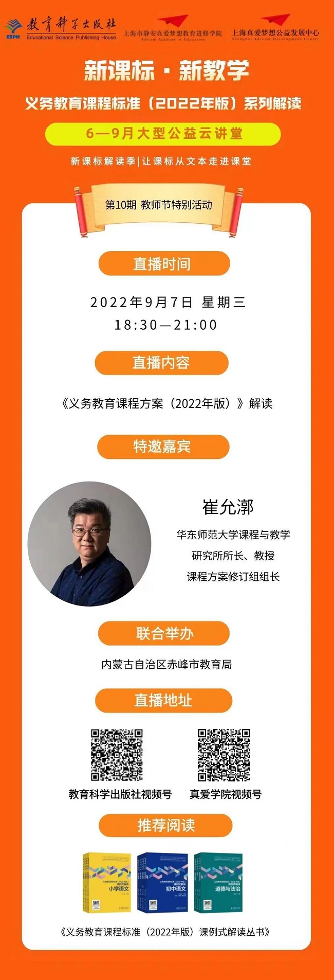 在第38个教师节即将到来之际,教育科学出版社将于2022年9月7日(周三)18:30推出最后一期活动,特别邀请2022年版课程方案修订组组长崔允漷教授带来精彩报告并与观众互动,敬请关注!