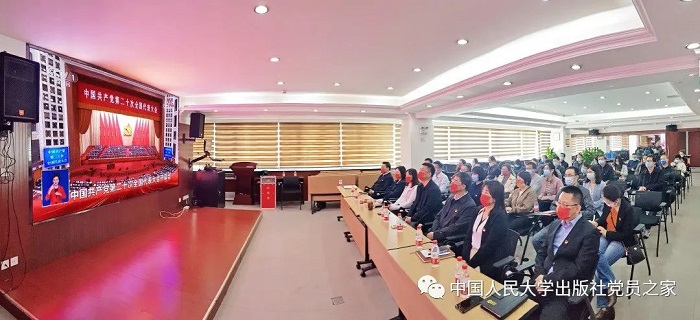 金秋十月山河锦绣、阳光灿烂,举世瞩目的中国共产党第二十次全国代表大会于10月16日上午10时在北京人民大会堂隆重开幕。中国人民大学出版社全体党委委员、党支部书记和各部门负责人在海淀黄庄办公楼七层会议室集中观看开幕会直播,出版社全体员工通过电视、电脑、手机、广播等多种方式,收看收听开幕会直播。