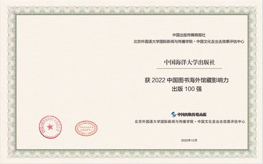 12月8日,由中国出版传媒商报、北京外国语大学国际新闻与传播学院和中国文化走出去效果评估中心联合主办的2022中国图书海外馆藏影响力报告正式发布。中国海洋大学出版社首次进入中国图书海外馆藏影响力出版100强。