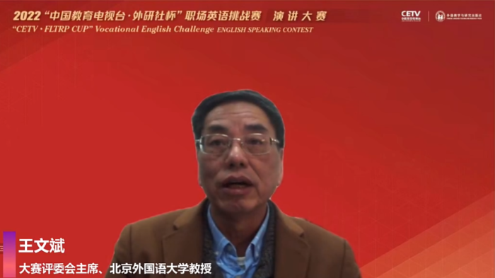 大赛闭幕式上,大赛评委会主席、北京外国语大学王文斌教授对选手们的精彩表现予以充分肯定,并对所有评委、指导教师及工作人员的辛勤付出表示感谢。王文斌教授指出,演讲能力对于任何岗位和职业而言都至关重要,很欣慰看到一批又一批职教学子在竞赛中展示出坚定的信心、积极的态度、缜密的逻辑思维和精湛的语言技巧。青年是国家和未来的骄傲,希望广大青年学子能够将“Think Big”的胸怀和站位带入学习和生活当中,坚持不懈,刻苦奋斗,收获更宽广的视野和更光明的未来。