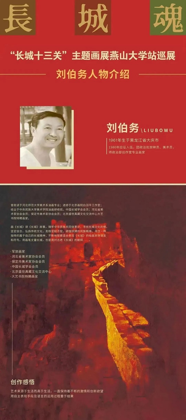 “长城魂”长城十三关主题画展展出的是著名画家刘伯务先生多年来精心创作的30余幅长城主题油画作品。他用军人的家国情怀,诗人的豪迈气质,史学家的丰厚积淀,画家的传情笔墨,细致描绘了长城十三关的风貌。