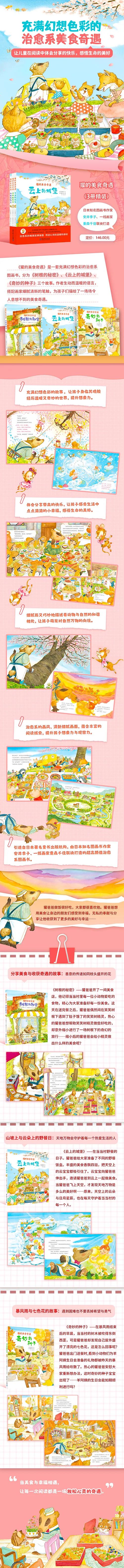 就像《獾的美食奇遇》,获得第12届日本绘本奖的安井季子用生动而温暖的语言,搭配知名画家重森千佳细腻清新的笔触,为我们讲述了《树根的秘密》《云上的城堡》《奇妙的种子》三个故事,匠心与创意的交织相融让“治愈系”“高颜值”“细节控”“隐藏线索”“人生哲理的幼儿启蒙”等等关键词都成为它不容被错过的理由。