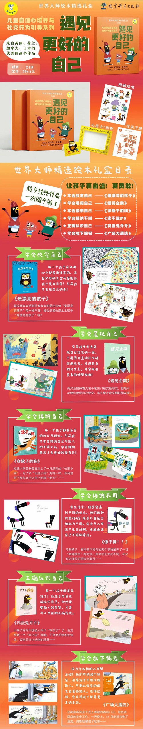就像“世界大师绘本精选礼盒”,家长们普遍关心的儿童自信心培养与社交行为引导将得到恳切回应,告诉孩子如何学会欣赏自己、学会展现自己、学会接纳自己、学会接纳不同、正确认识自己、学会放下偏见,用有趣的故事引导孩子管理情绪,养成良好的社交行为习惯。