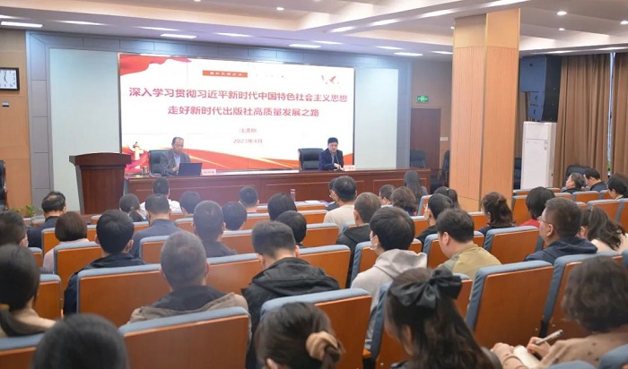为深入开展学习贯彻习近平新时代中国特色社会主义思想主题教育,引领广大党员干部在主题教育中感悟思想伟力、凝聚奋进力量。4月27日下午,郑州大学出版社党总支书记、董事长汪流明以“深入学习贯彻习近平新时代中国特色社会主义思想,走好新时代出版社高质量发展之路”为题为全社党员干部讲专题党课。出版社领导班子成员、全体党员、入党积极分子等70余人聆听了党课。党课由出版社社长、总编辑孙保营主持。