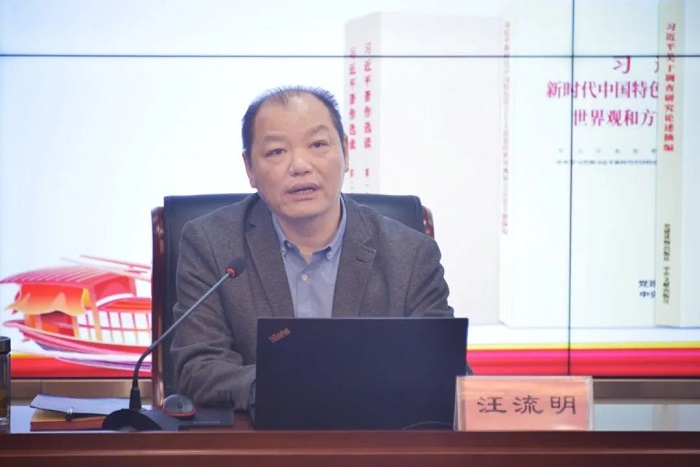 汪流明从习近平新时代中国特色社会主义思想的创立、习近平新时代中国特色社会主义思想的主要内容、深入开展学习贯彻习近平新时代中国特色社会主义思想主题教育的重大意义等方面,并结合党的二十大报告的核心要点、党的二十大对党章修改的要点等与大家进行了深入交流,详细论述了习近平新时代中国特色社会主义思想的产生和发展。他指出,习近平新时代中国特色社会主义思想是当代中国马克思主义、二十一世纪马克思主义,是中华文化和中国精神的时代精华,是全党全国各族人民为实现中华民族伟大复兴而奋斗的行动指南,必须长期坚持。