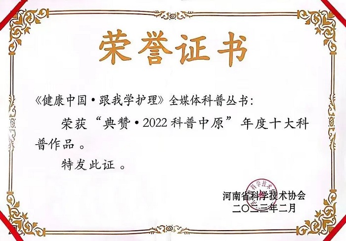 郑州大学出版社出版的《健康中国•跟我学护理》全媒体科普丛书入选“典赞·2022科普中原”十大科普作品。