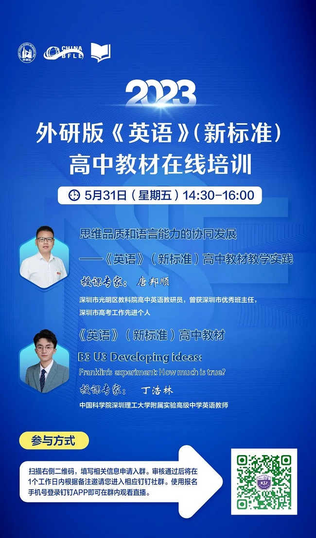 为引领广大《英语》(新标准)高中教材使用区老师们更好地落实新课标、实施新课程,外语教学与研究出版社于2023年开展了主题为“有效阅读及读写结合的实现路径”系列在线培训。本期培训,我们有幸邀请到深圳市光明区高中英语教研员唐邦顺老师及其团队围绕《英语》(新标准)高中教材,聚焦高中英语有效阅读提出教学实施策略,并做教学案例分析。