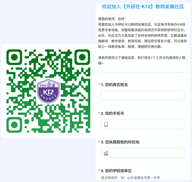 本系列在线培训通过 “外研社·K12教师发展社区”进行。请您于5月30日12:00前,下载钉钉手机APP并使用钉钉扫描下方二维码,填写相关信息,申请加入“外研社·K12教师发展社区” (为了直播后培训证书的准确发放,请各位老师提前申请入群)。工作人员将根据备注邀请您进入相应群中,届时您在群中可完成直播收听。