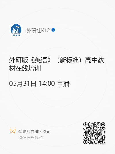通过“外研社K12”视频号预约直播(无学时证书)。长按识别下方二维码,即可一键预约。