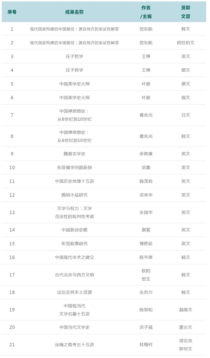 北京大学出版社此次共有21个项目入选,包括《现代国家构建的中国路径:源自地方的尝试性解答》韩文版1个重点项目,及《魏晋玄学史》英文版等20个一般项目,涉及英文、德文、俄文、阿拉伯文、日文、韩文、越南文、蒙古文、塔吉克斯坦文等9个文版。