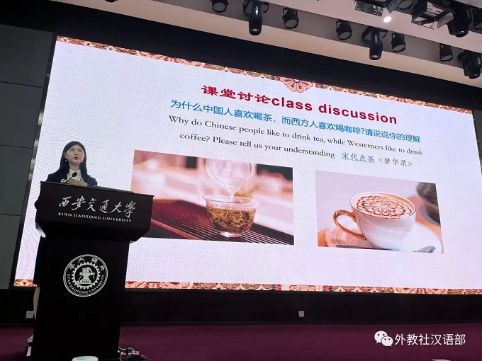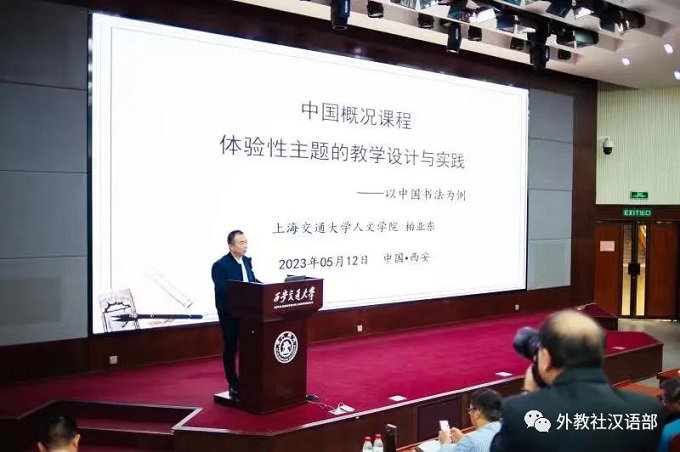第六个报告由上海交通大学人文学院副研究员柏亚东分享,他以书法课为示例,展现中国概况课程体系中体验性课堂的教学设计,用生动的课堂实录展现了中国书法的魅力。