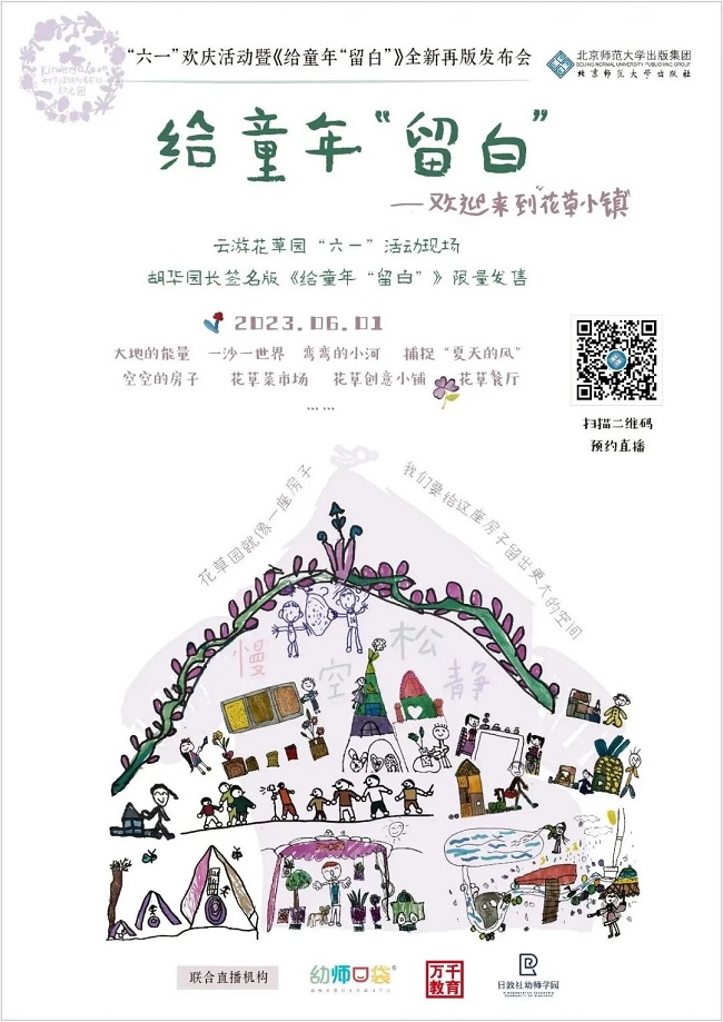 如果你想了解花草园“六一”活动背后的创造与思考,欢迎扫描海报中的二维码,我们相约直播间,一起云游花草园,全景式观赏花草园“六一”活动;参加《给童年“留白”》一书全新再版的发布会,听胡华园长和老师们讲述“给童年留白”背后的故事……