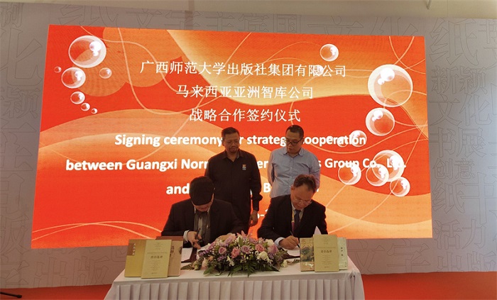 当天,首先举办了广西师范大学出版社集团有限公司与马来西亚亚洲智库公司战略合作签约仪式。双方将就“东方智慧丛书”图书合作推广、海外数字平台共建、中医文化图书系列和中国作家凡一平文学图书系列版权输出等进行深度合作。在马来西亚教育部国家图书委员会主席莫哈末·柯海尔·瓦迪隆、中宣部进出口管理局有关同志的见证下,黄轩庄和亚洲智库执行董事周和代表双方签署协议。
