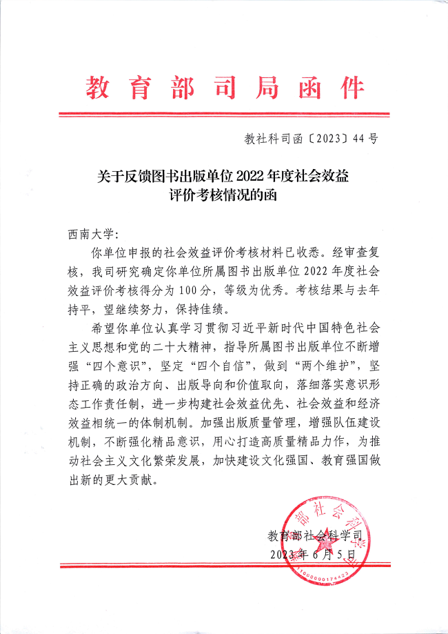 近日,经教育部审查复核,西南大学出版社在图书出版单位2022年度社会效益评价考核中取得100分满分,再次被评为优秀等级。