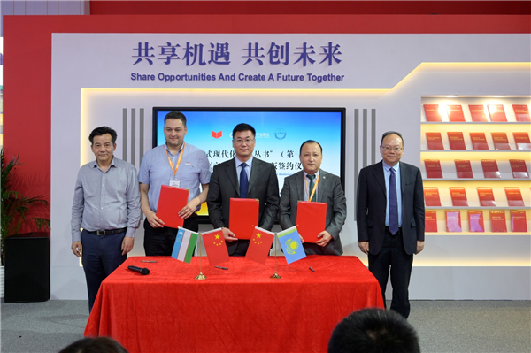 随后,在赵海云副局长和王轶副校长的共同见证下,李永强董事长与阿达依·赛肯总经理、图利亚加诺夫·欧贝克总经理分别签署“中国式现代化研究丛书”(第一辑)哈萨克文、乌兹别克文版权输出协议。