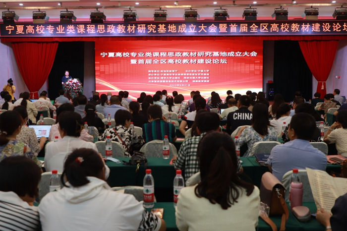 6月21日,宁夏高校专业类课程思政教材研究基地成立大会暨首届宁夏高校教材建设论坛在宁夏大学召开。宁夏回族自治区教育工委副书记李玮,宁夏大学副校长李建设、本科生院院长张亚红,清华大学出版社副总编辑孙宇,西安交大出版社副总编辑秦茂盛,宁夏回族自治区教育厅学生工作处、教育工委思想政治处、教材处负责人,各高等学校从事教材建设的主管领导,教务处、教学发展中心负责人、教材建设管理人员及骨干教师代表近200人参加论坛。