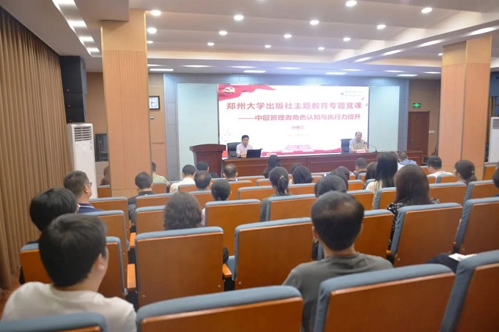 6月21日下午,郑州大学出版社社长、总编辑孙保营以“中层管理者的角色认知与执行力提升”为题为全社党员干部讲主题教育专题党课。出版社领导班子成员、全体中层管理人员、各党支部委员等50余人聆听了党课。本次党课由出版社党总支书记、董事长汪流明主持。