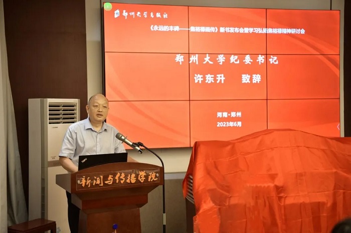 许东升致辞。他代表郑州大学对出席会议的领导和专家表示欢迎和感谢。许东升指出,郑州大学与焦裕禄有着深厚的“渊源”,郑州大学把研究、阐释、宣传焦裕禄精神作为重要使命,把弘扬焦裕禄精神作为校园文化建设的重要内容。《永远的丰碑——焦裕禄画传》的出版发行,是郑州大学深入学习贯彻党的二十大精神和学习贯彻习近平新时代中国特色社会主义思想主题教育的具体举措,是郑州大学研究阐释和宣传弘扬焦裕禄精神的又一成果。
