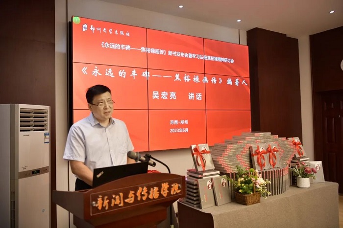 在喜迎建党102周年之际,6月30日上午,由郑州大学出版社、郑州大学焦裕禄精神研究中心共同举办的中宣部2022年主题出版重点出版物选题《永远的丰碑——焦裕禄画传》新书发布暨学习弘扬焦裕禄精神研讨会在郑州大学穆青研究中心举行。《焦裕禄画传》编著人、河南省政协民族和宗教委员会主任、河南省焦裕禄精神研究会副会长吴宏亮,《焦裕禄画传》编委会顾问、焦裕禄干部学院名誉院长、焦裕禄同志二女儿焦守云,河南省委宣传部二级巡视员梁莉,河南省委党史和地方史志研究室副主任李海民、一处处长王黎锋,河南省税务局二级巡视员钱金培、党建处处长孟珊,郑州大学党委常委、纪委书记、监察专员许东升,河南农业大学党委原常务副书记、河南省焦裕禄精神研究会常务理事李少兰,河南省焦裕禄精神研究会副会长兼秘书长、郑州大学焦裕禄精神研究中心主任、郑州大学南校区管理中心主任曹振宇;郑州大学出版社党总支书记、董事长汪流明,出版社社长、总编辑孙保营,副总编辑崔青峰,副社长李海涛;焦裕禄干部学院、山东淄博焦裕禄干部教育学院、河南省焦裕禄精神研究会、河南兰考焦裕禄同志纪念馆、河南尉氏焦裕禄事迹展览馆、“焦裕禄在杞县”手稿展示馆、洛阳中信重工集团、河南省新华书店等单位的相关负责人,以及省内外焦裕禄精神研究专家等40余人出席会议。