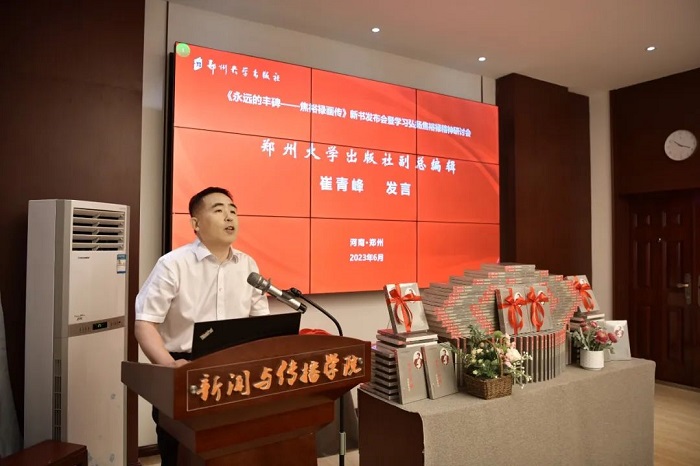 崔青峰在发言中介绍了《永远的丰碑——焦裕禄画传》的选题策划及出版过程。他用焦书记的三句话——“榜样的力量是无穷的”“办法总比困难多”“吃别人嚼过的馍没味道”详细介绍了郑大出版社策划出版本书的动因以及创新出版本书的价值追求。他表示,在编写出版画传的一年多时间里,焦书记的事迹深深感染和感动着我们,焦裕禄精神时时激励、鞭策着我们,焦裕禄精神也将永远激励我们踔厉奋发、勇毅前行。