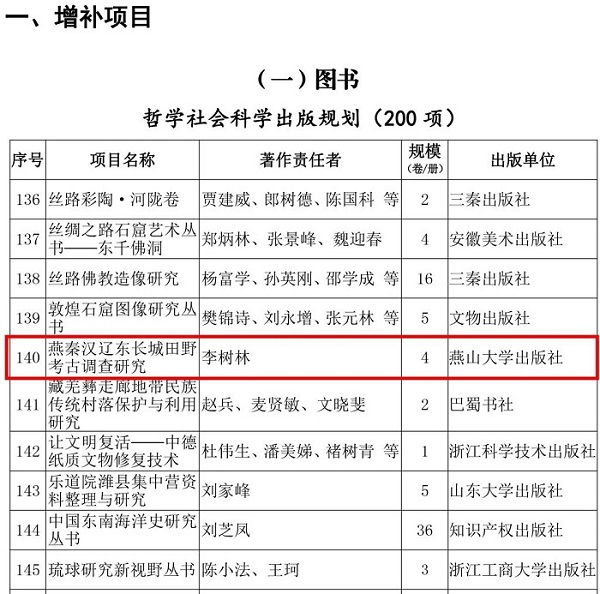 6月28日,国家新闻出版署下发通知,公布了“十四五”国家重点出版物出版规划调整情况,燕山大学出版社策划的图书《燕秦汉辽东长城田野考古调查研究》成功入选增补项目中的“哲学社会科学出版规划项目”。