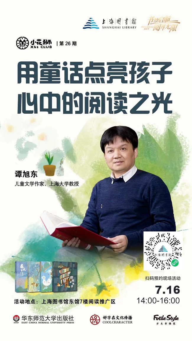 7月16日14:00,知名儿童文学作家、理论家谭旭东教授结合多年创作经验和研究成果,将在上海图书馆东馆7楼阅读推广区带来“用童话点亮孩子心中的阅读之光”的主题讲座,带领孩子们遨游在美好的童话世界,传授自主阅读的好方法。