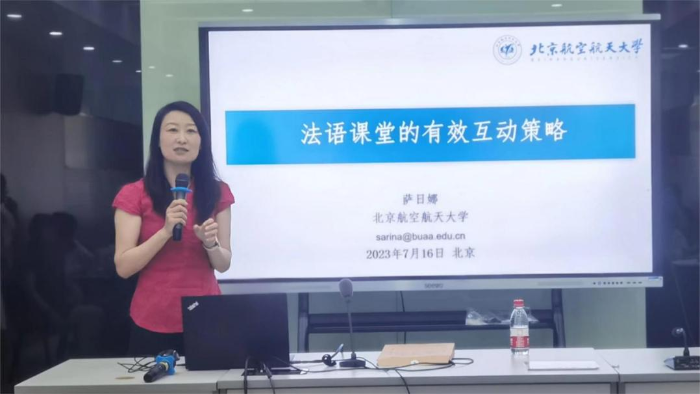 萨日娜教授以“法语课堂的有效互动策略”为题,指出课堂互动包括师生互动和生生互动两个环节。在师生互动中,教师要注重对学生的反馈,但要注意以鼓励引导为主,课后认真反思教学效果的达成情况。她强调了混合型反馈对于调动学生学习积极性的重要意义,在使用任务教学法的过程中,要避免脱离生活实际,提问也要具体化。每个教学活动专注一个目标,并注意及时调整。最后,她以丰富的事例指出学生互动中出现的问题,引发老师们深入思考。