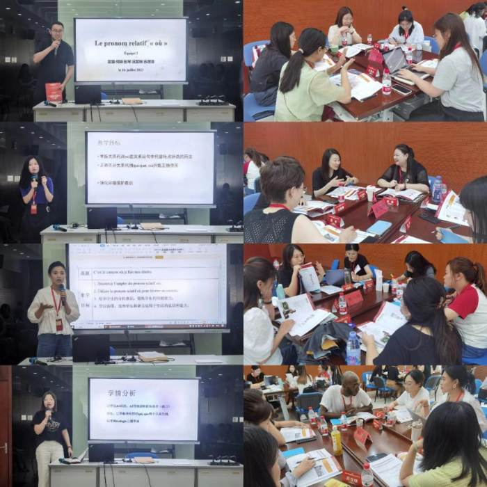 随后,各语种教师根据工作坊素材分小组展开教学设计,同课异构,助力共研。刘娟教授、王露杨副教授、萨日娜教授和郑皓瑜副教授分别对俄语、德语、法语和西班牙语各小组进行详细指导。经过积极讨论和深入交流,各小组在短时间内顺利完成了新课例的教学设计。专家们充分肯定了老师们的高效协作,并对每个小组的教学设计进行了深入的评析和建议。
