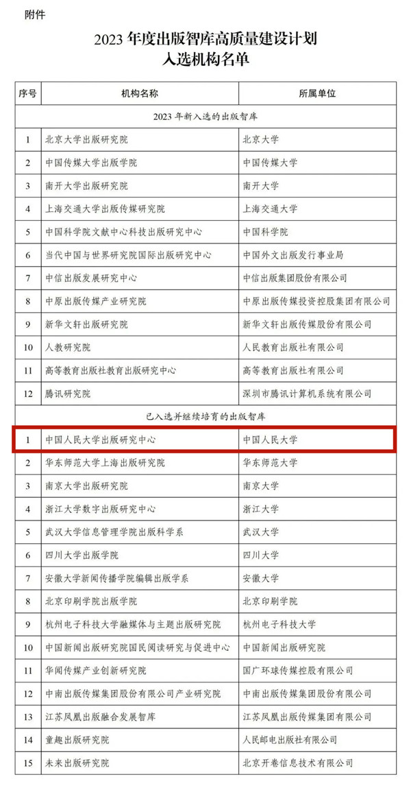 近日,国家新闻出版署公布2023年度出版智库高质量建设计划入选机构名单,中国人民大学出版社成立的中国人民大学出版研究中心名列其中。2022年8月,中心入选第一批出版智库遴选培育机构名单,入选一年来工作开展扎实、研究成果突出,此次继续入选,并列入国家新闻出版署将在2023年继续资助的7家优秀机构之一。
