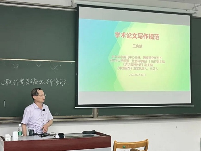 东华大学期刊中心王克斌主任主讲的课程是“学术论文写作规范”。他分别从东华大学学报的内容简介、学报特色、投稿指南、审批流程、论文规范等多个方面进行了详细介绍。他还针对不同学术期刊的选题要求,论文意识形态的把控以及文字、标点符号、量和单位、参考文献著录格式等方面,对学术论文的撰写规则进行了系统的讲解。