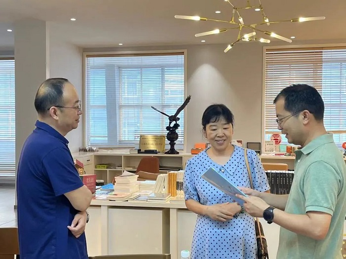 基教分社洪亮社长(左)、仝玉林总编辑(右)与龙琪主编(中)交流