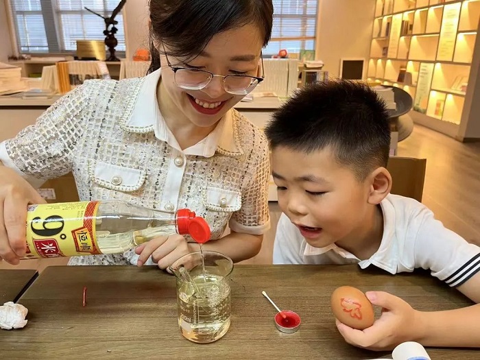 活动现场,“在鸡蛋上写字作画”“制出粉红色喷泉”“红椒汁变青椒汁”等不同有趣的实验内容,在家长的陪同和专业老师的指导下被同学们如变戏法般顺利展示了出来。此次活动的四个实验分别选自《小学生生活实验阅读(1—4册)》各册,内容由浅入深、从易到难,适合中高年级小学生学习、操作。