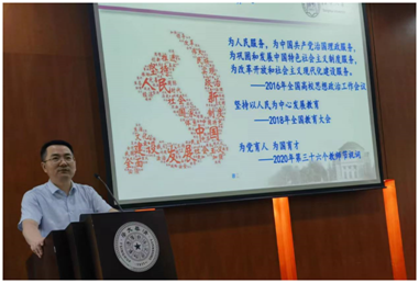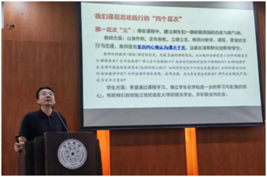 张瑜从立德育人与课程思政两个方面,结合清华大学土木水利学院、机械工程学院、物理系等的具体课程与典型案例,回答了培养什么人、怎样培养人、为谁培养人这一教育的根本问题,阐述了如何实现立德树人润物无声的效果。张瑜指出,课程思政是一种新的课程教育教学理念,要将高校思想政治教育融入课程教学和改革的各环节、各方面,激发学生的爱国热情与奋斗精神,同时坚持教书和育人相统一、言传和身教相统一、学术自由和学术规范相统一,建立“价值塑造、能力培养、知识传授”三位一体的教育模式。