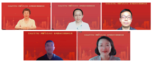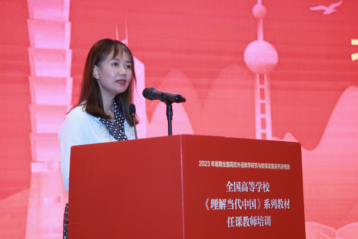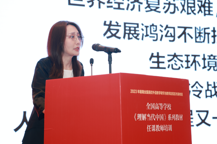 为帮助任课教师深入学习领会“习近平新时代中国特色社会主义思想”相关专题内涵,进一步把握《理解当代中国》系列教材内容,培训特别设置专题讲解环节,7位发言人分别基于《理解当代中国》系列教材内容,结合不同课程教学特点,就“以人民为中心”“中国特色大国外交”“教育强国”“文化自信与文化建设”“全过程人民民主”和“依法治国”等主题进行讲解,就服务国际传播能力建设的外语人才评价模式进行分享。
