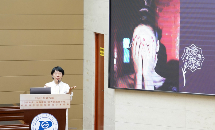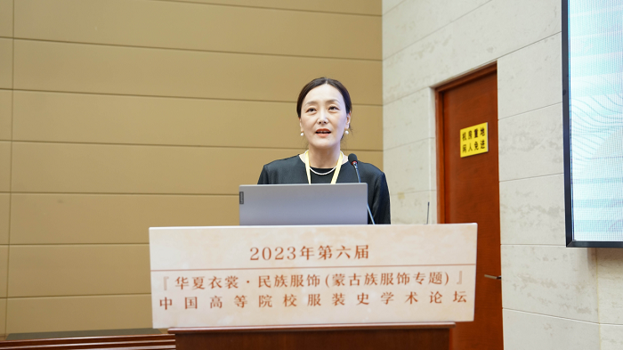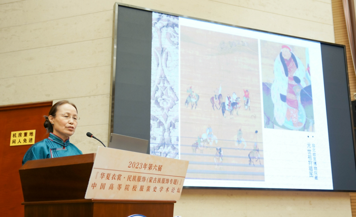 内蒙古工业大学轻工与纺织学院史慧教授发言的主题是“蒙古袍形制及其传统装饰工艺研究”。她认为,蒙古袍与中华传统袍服形制一脉相承,不仅形成了鲜明的民族特色,也演绎出具有地域差异的内部多样性,是中华传统服饰形制一体多元的生动体现。史教授说,蒙古袍是蒙古族人民长期实践的智慧结晶,所展现的艺术特征和审美价值具有显著的文化属性,所体现出的思想感情、风俗习惯和审美观念是文化价值的核心,也是研究蒙古族服饰文化本质的重要依据。研究蒙古袍形制的多样性成因,分析传统装饰工艺的构成、应用组合规律,探索其数字可视化路径,可为传统装饰工艺数字可视化传承提供数据和解决方案。