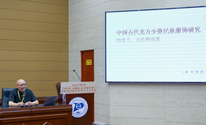 东华大学的包铭新教授以“中国古代北方少数民族服饰研究的意义、方法和成果”进行了主题演讲。包教授从中国古代少数民族的主要活动轨迹和历史贡献,中国古代北方少数民族研究的材料和方法,中国古代北方少数民族对中原汉族服饰及其章服制度的态度和抉择,中国古代北方少数民族服饰的汉化和“涵化(acculturation)”, “质朴坚实的汉人”如何变成了“富丽堂皇的唐人”, 契丹人南北分治的二元政治主张及其“中国意识”等方面对中国北方少数民族的服饰进行了深入阐述。包教授的讲演既有宏观的如何选题,又有具体的研究路径,体现了他独特的研究特点。包教授还结合反映蒙元服饰的文献和图像向大家讲述如何对这些资料进行具体化研究,鼓励青年学者要大胆设想,做服装史研究要有勇气有毅力。让参会的老师深受启发。