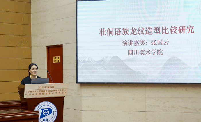 四川美术学院张国云教授发言的主题为“壮侗语族龙纹造型比较研究”。她在发言中提到,一个语族的纹饰符号意义,既能够表达出单个民族的思想情感,也能够让整个语族达成共识,并形成约定俗成的观念,构建整个语族共有的、具有代表性和象征性的记号或图形符号,这种由单一民族纹饰发展到一个语族的共有符号的过程,大概就是人类文明从自然界的图形到社会文化中的文字符号所历经的过程。壮侗语民族龙纹作为一个语族文化的符号,通过象形、比拟、表意等表现手法,表现出它独特的母性文化象征意义与价值。