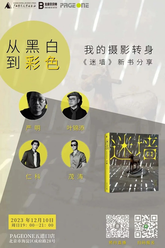 12月10日(周日)19:00在PAGEONE五道口店,有幸邀请到著名电影与舞台美术指导叶锦添,他是摄影科班出身,对此有着深刻的体悟。还有五条人乐队的仁科和茂涛,作为新晋国民摇滚乐队,他们以其独特的审美感受力被大众所熟知,他们与严明是多年好友,会引入亲切与活泼的视角。相信几位嘉宾艺术家会和严明一道,碰撞出灵光四射的火花。📍 欢迎大家扫码预约直播或报名入场。