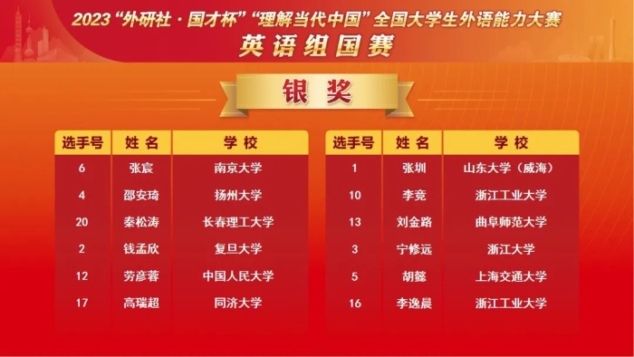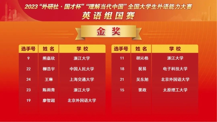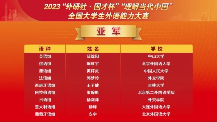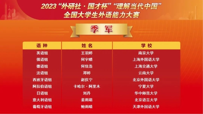 12月8日,2023“外研社·国才杯”“理解当代中国”全国大学生外语能力大赛国赛圆满落幕。近2500名选手在国赛舞台完成一场场风采竞技,用外语诉说源远流长的中华文脉,展现举世瞩目的中国发展,尽显兼济天下的世界情怀。